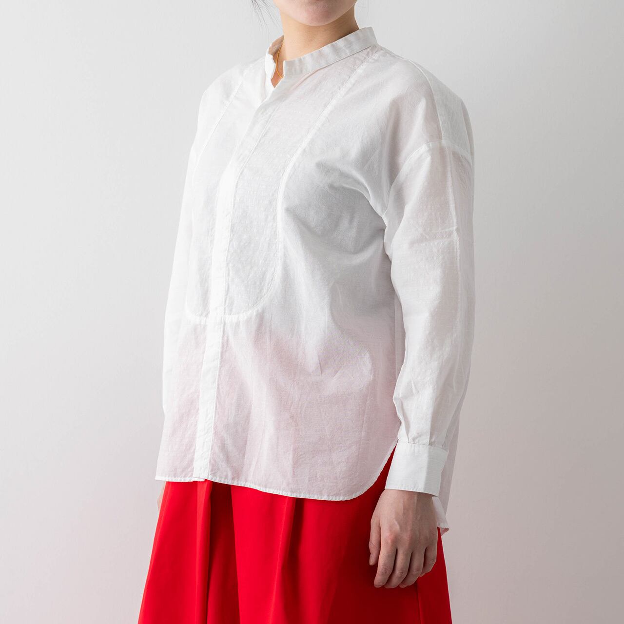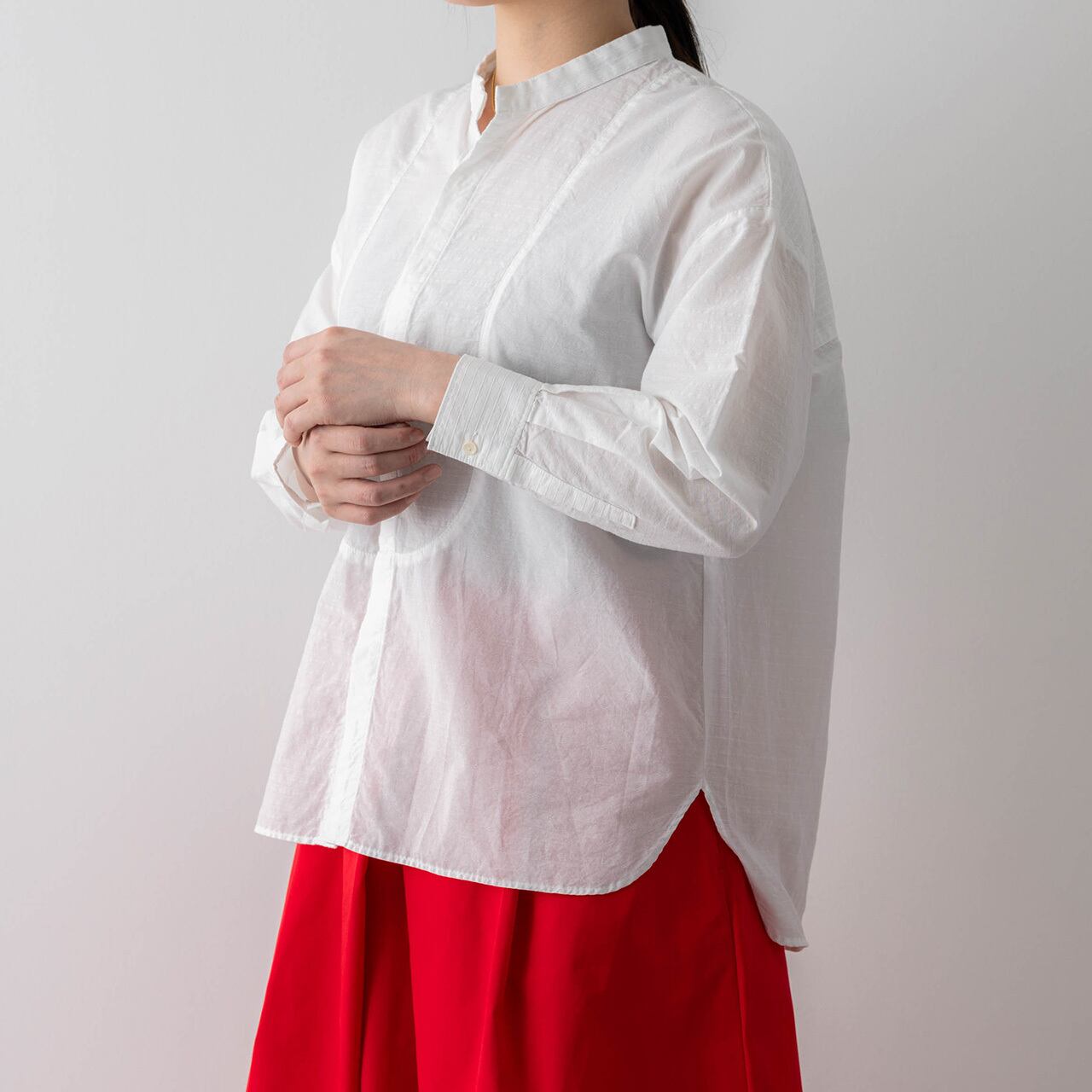 シンプルなシャツ選びは、大人になるとちょっと工夫が必要。一見シンプルに見えても、切り替えやタックなどこだわりがあるデザインで、ゆったりフォルムながらもすっきりみえるものが、ポイントです。