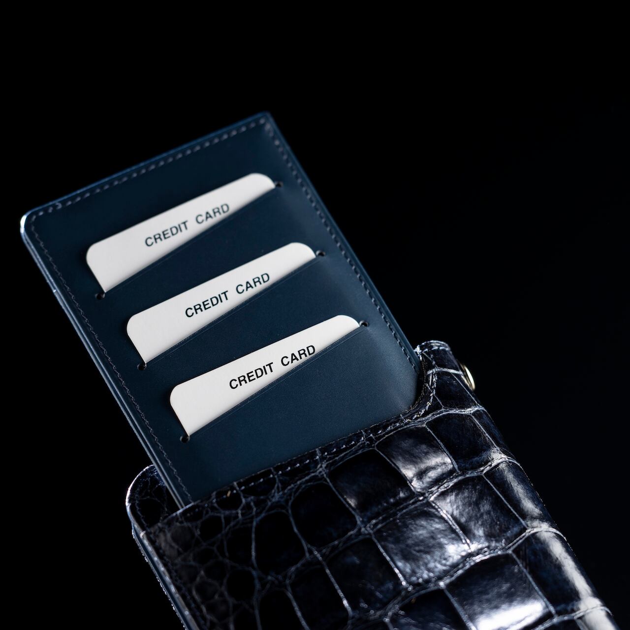 外は深い輝きのあるネイビーのクロコ革に、内も艶のあるネイビーの牛革のエレガントシックな組み合わせ。