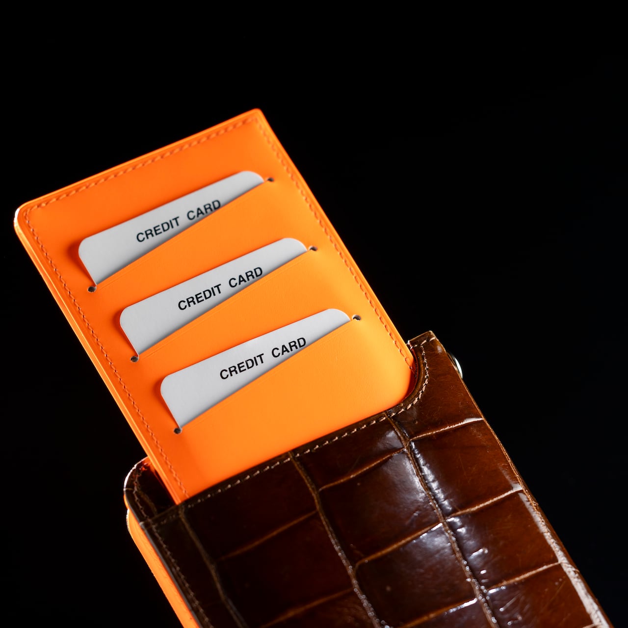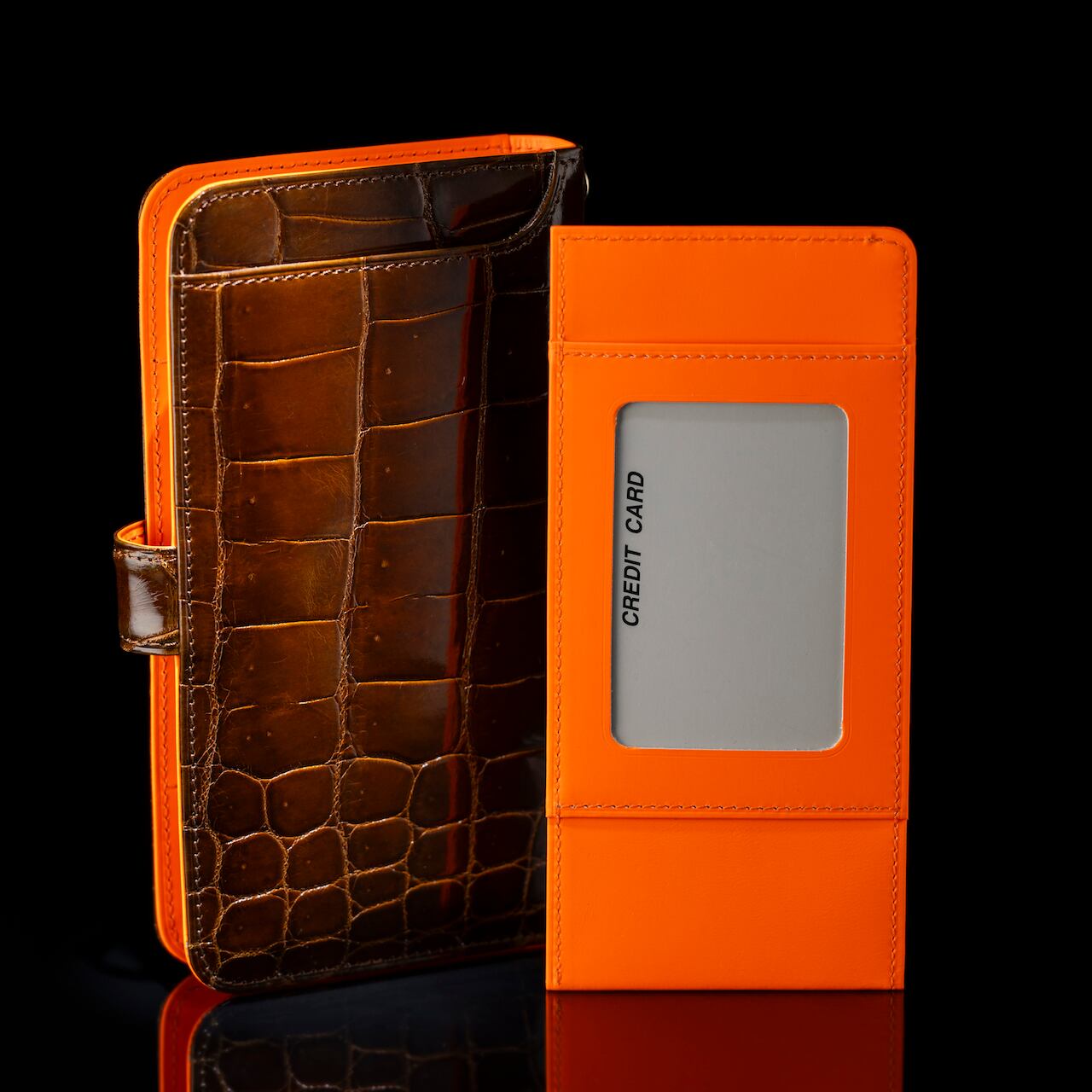 もう1色のブラウンは、つややかなクロコ革に内は、鮮やかなオレンジの牛革を組み合わせた、POPなデザインです。