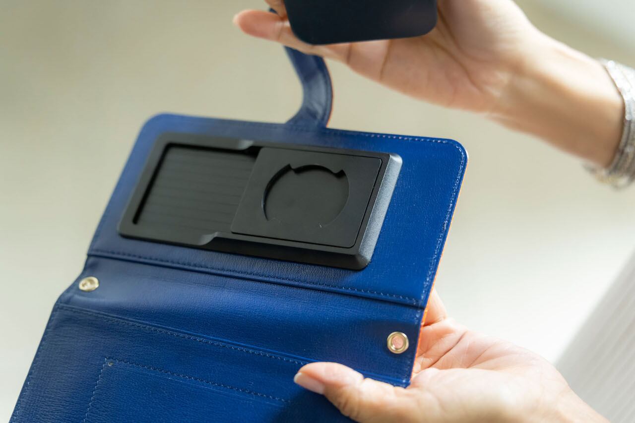 背面のポケットには同じくロイヤルブルーのケース付き。取り外しでき、免許書や名刺、カードキーが入れられる。