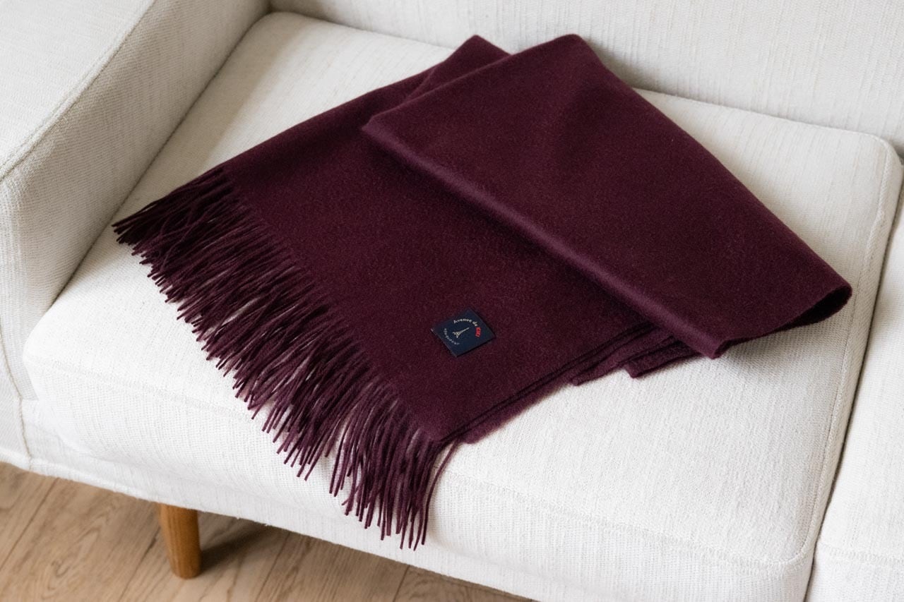 濃く、深い紫は、カシミヤの光沢とともにエレガントな印象。黒やネイビーにも近いのでどんな色ともよく合います。