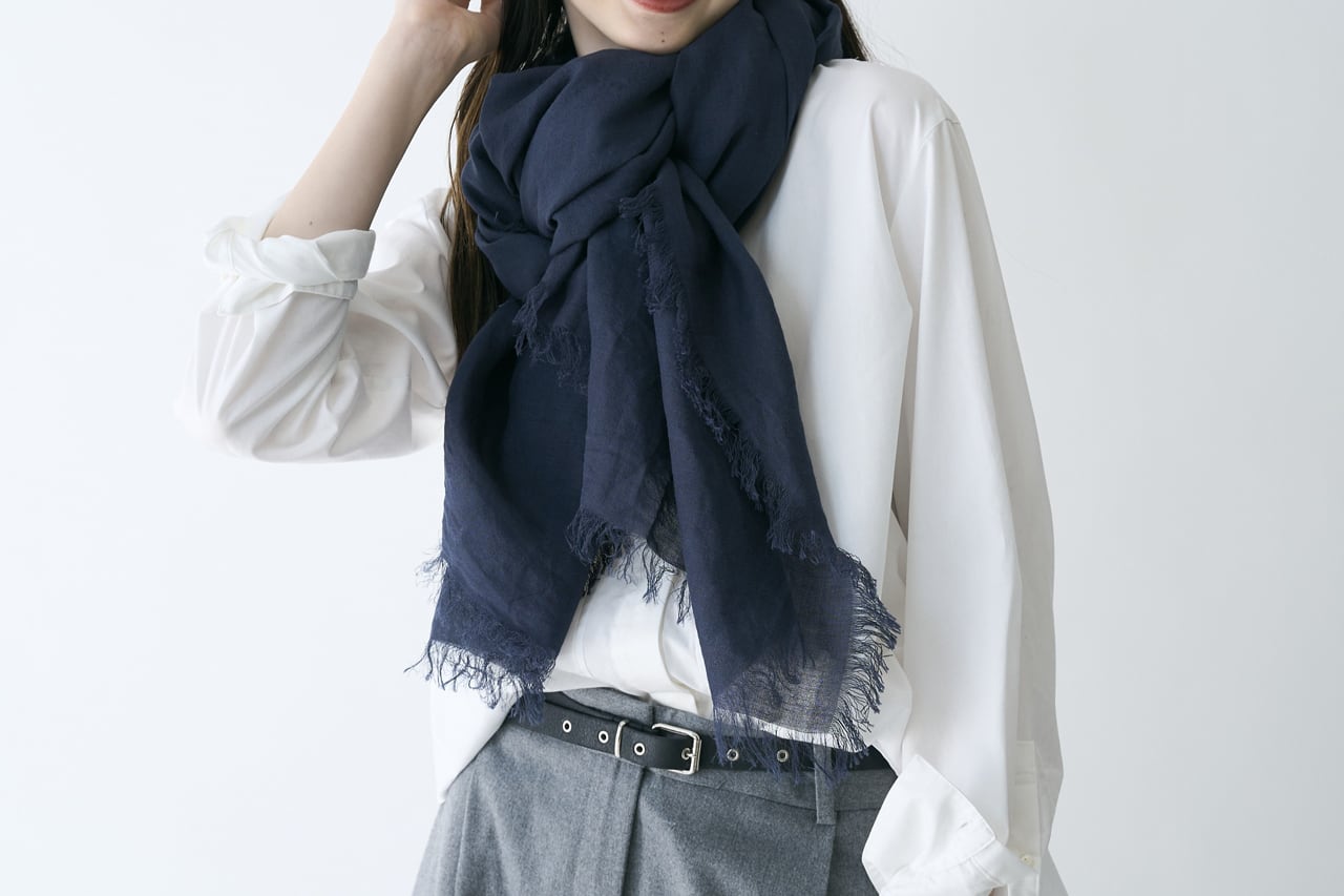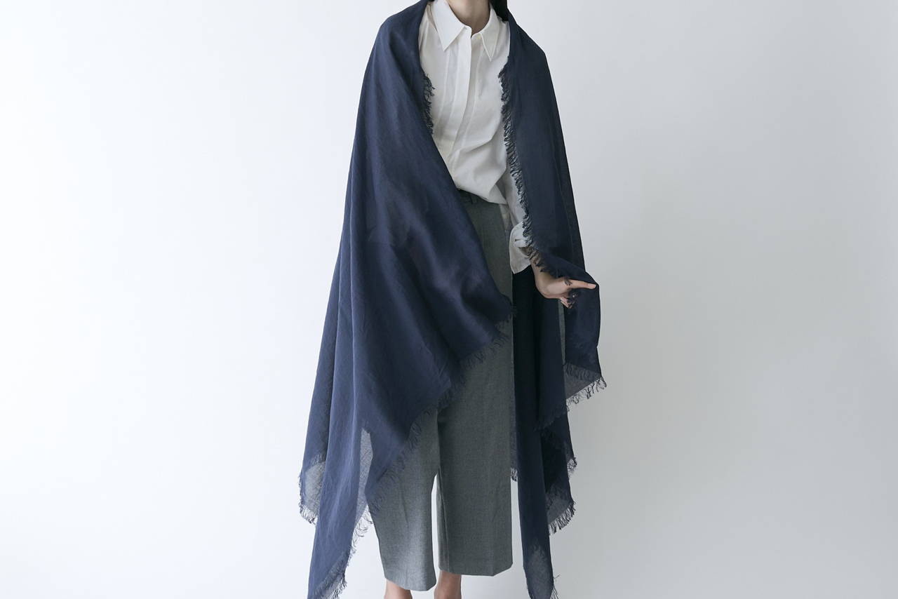 いずれも細い糸で空気感を持つように織られていて、オールシーズンに対応の大判ストールに仕上がっています。春・夏・秋は1枚で、冬場は重ねて巻くとコーディネートの幅も広がります。
