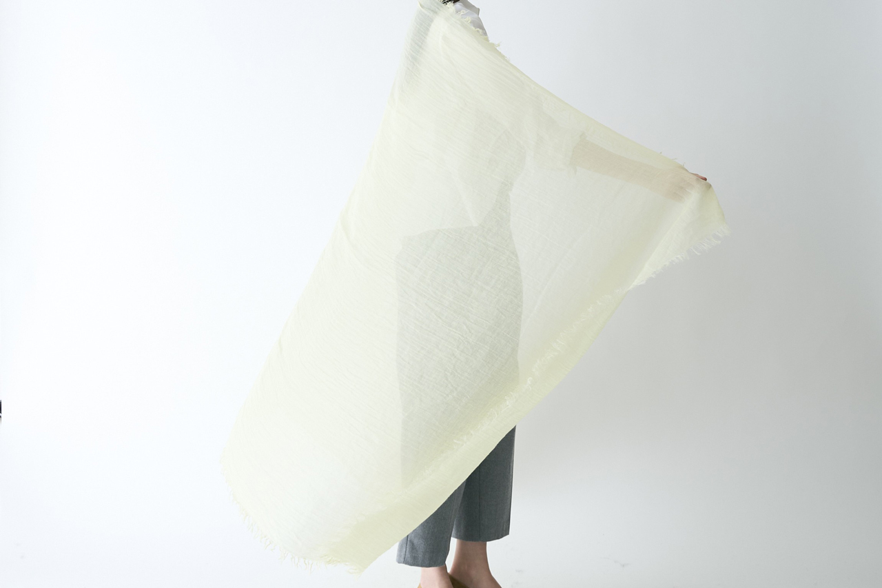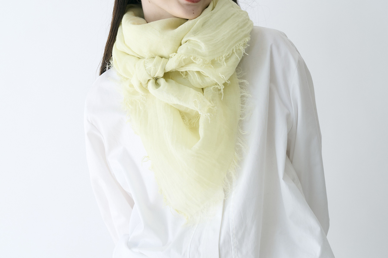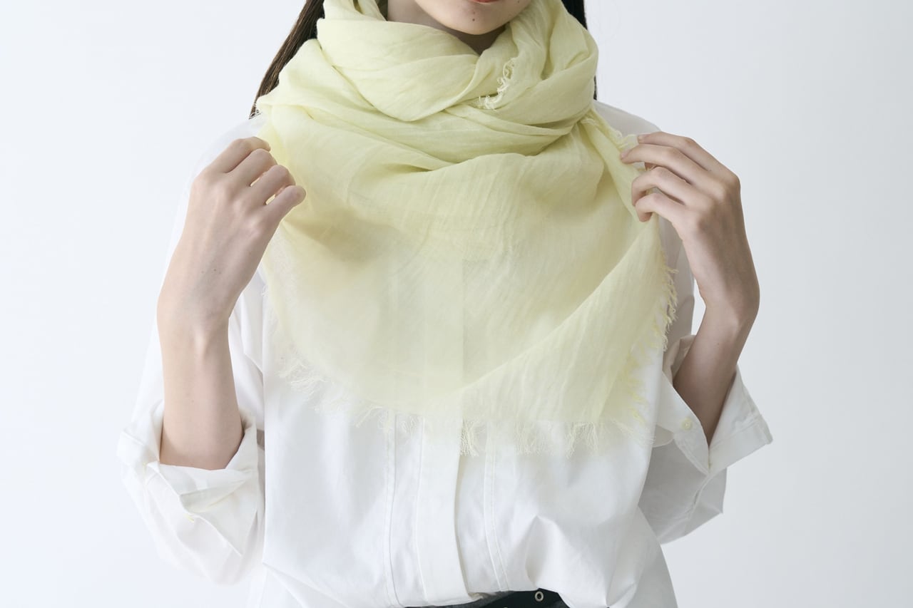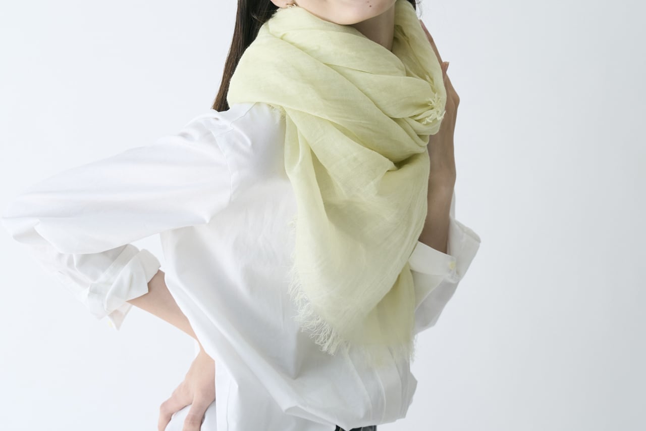 アイボリーに近い淡いイエローは顔色を明るくしてくれます。透け感があるので、羽織るとエレガントに。大判なので首に巻くとふわっとボリューム感のあるニュアンスが演出できます。