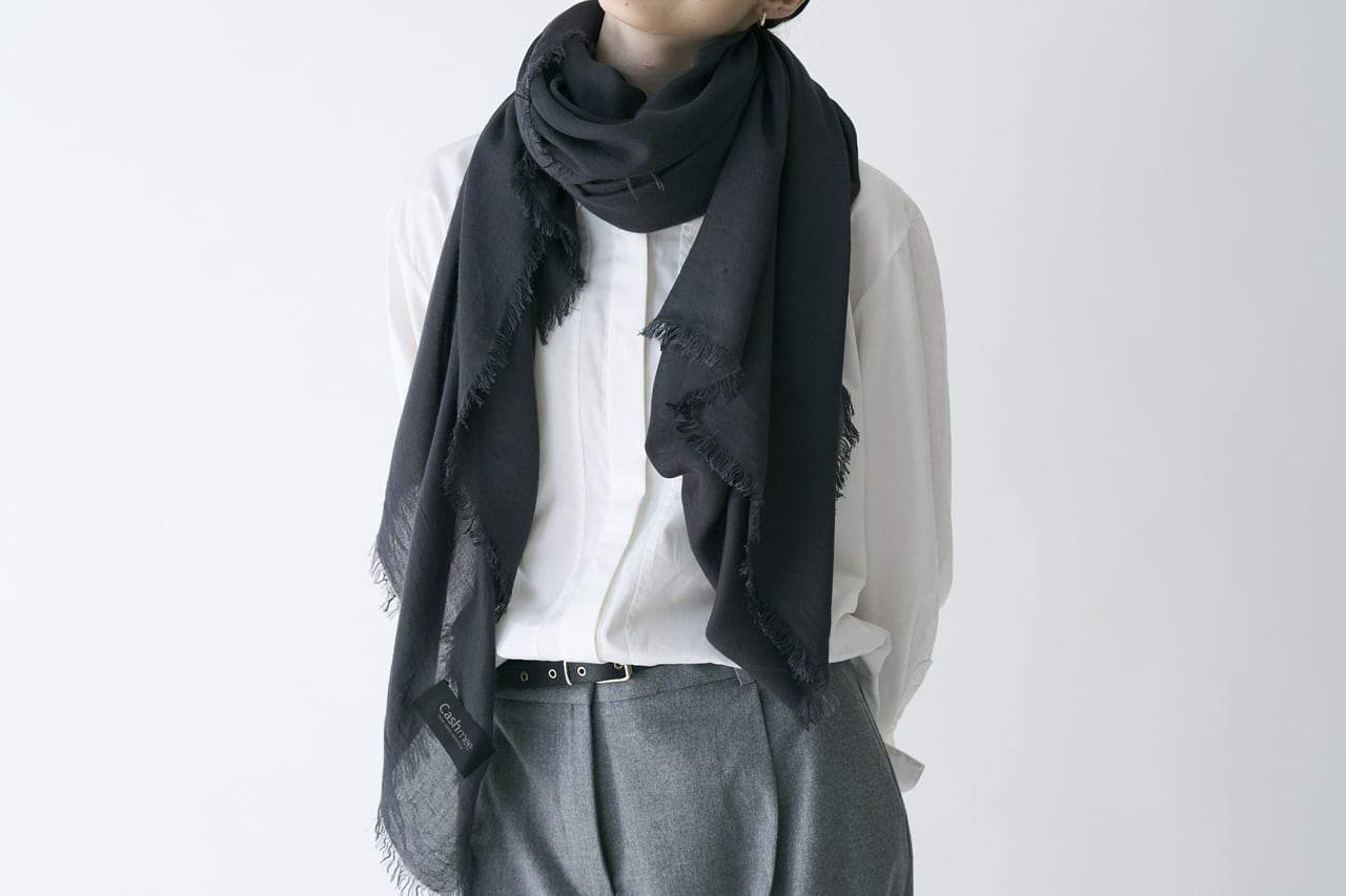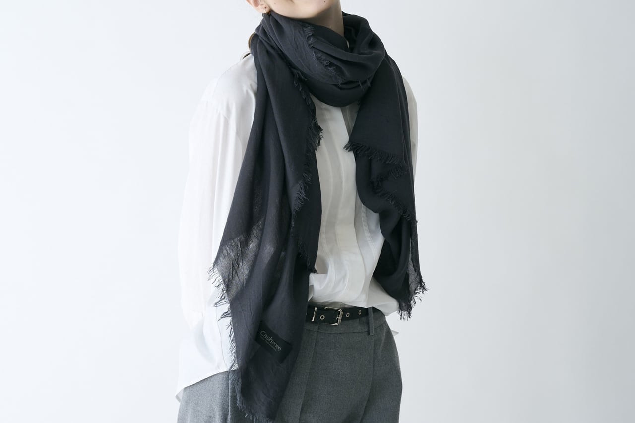 だからレストランやホテルに行く時や列車や飛行機に乗る時に薄手のストールは欠かせません。カシミヤ100%よりさらに薄くて軽く、夏にも対応できる爽やかさがある、このストールも1枚は持っておきたいアイテムです!」