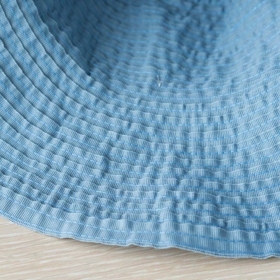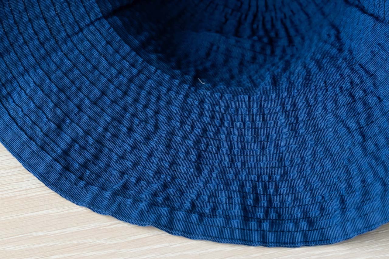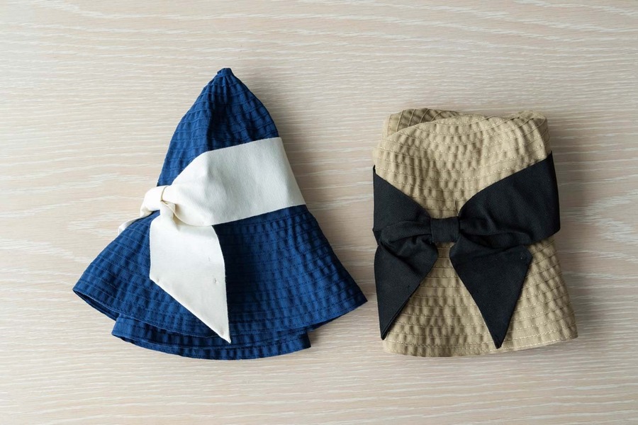 本体は刺し子のように全体に縫い目が入っているので、丈夫で型崩れしにくくなっています。こだわりの幅広リボンも軽く留めているので、たたんでもはずれません。