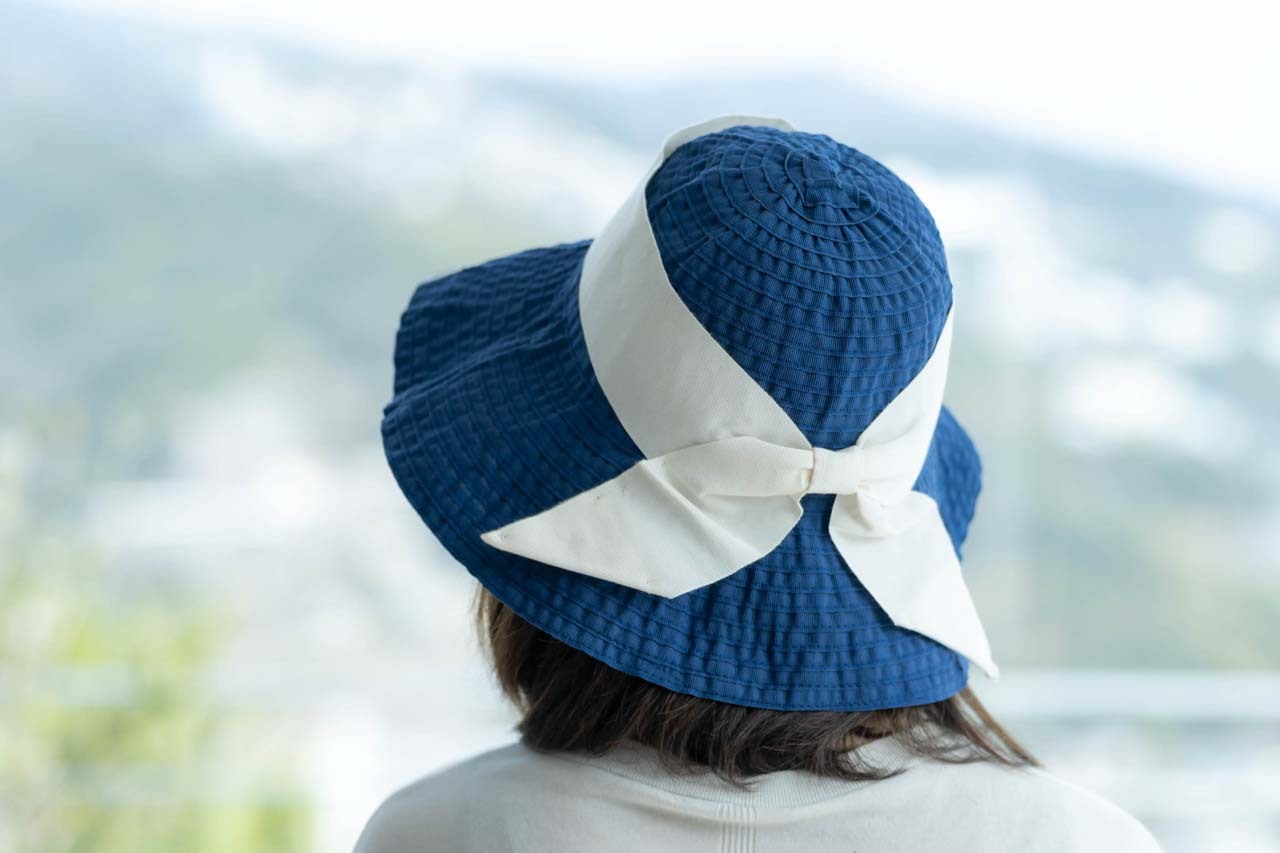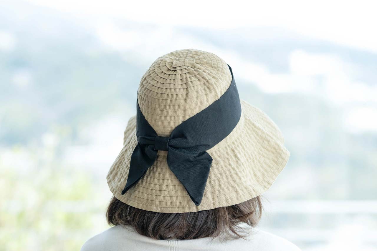 「布の防止って、登山用とかカジュアルなデザインが多いのですが、これはリボンが大きくて可愛い!!!つばも広いので、エレガントですね。