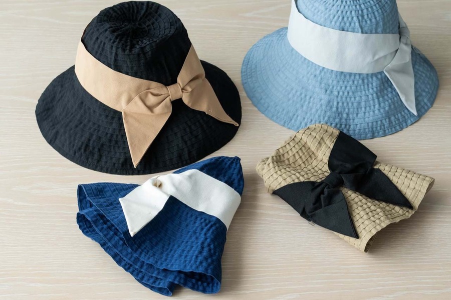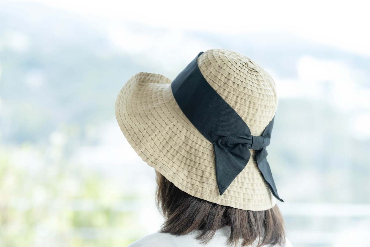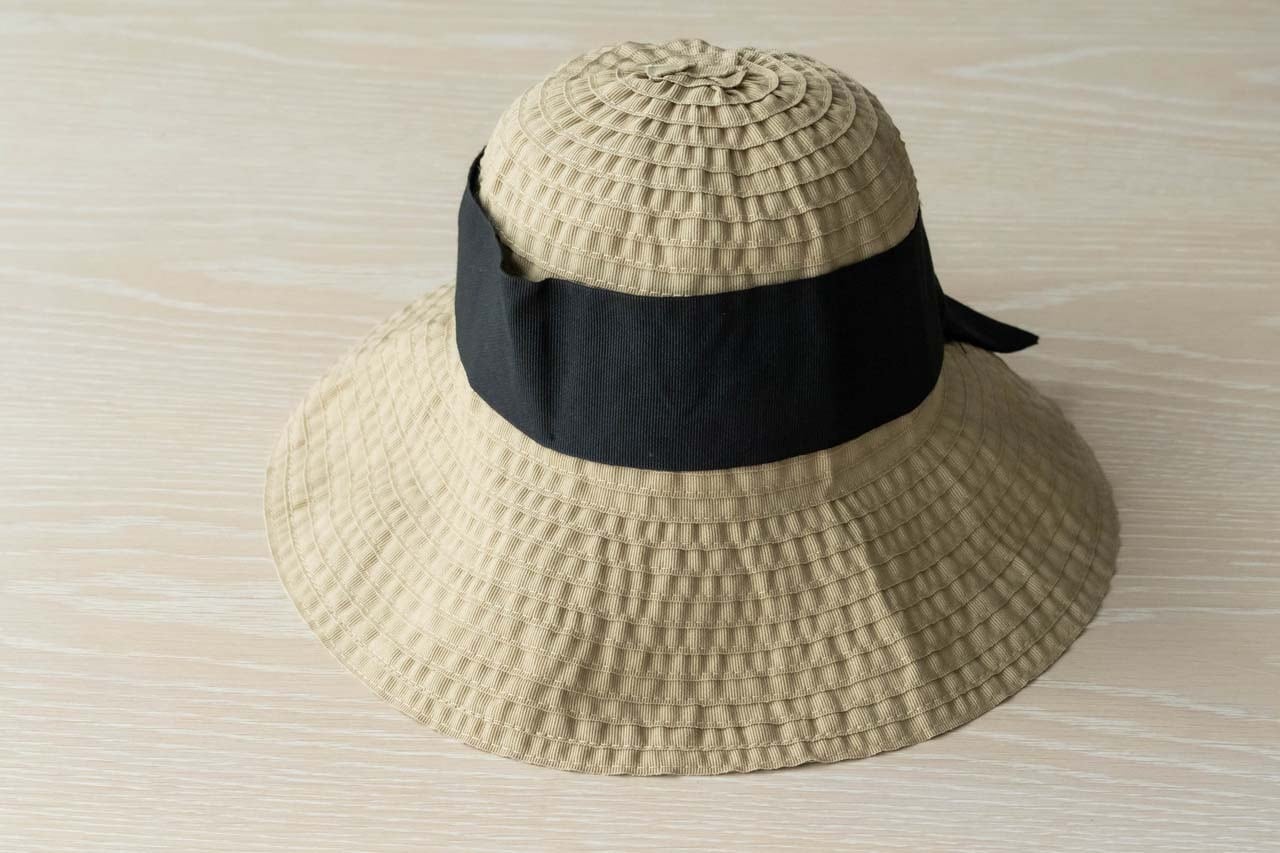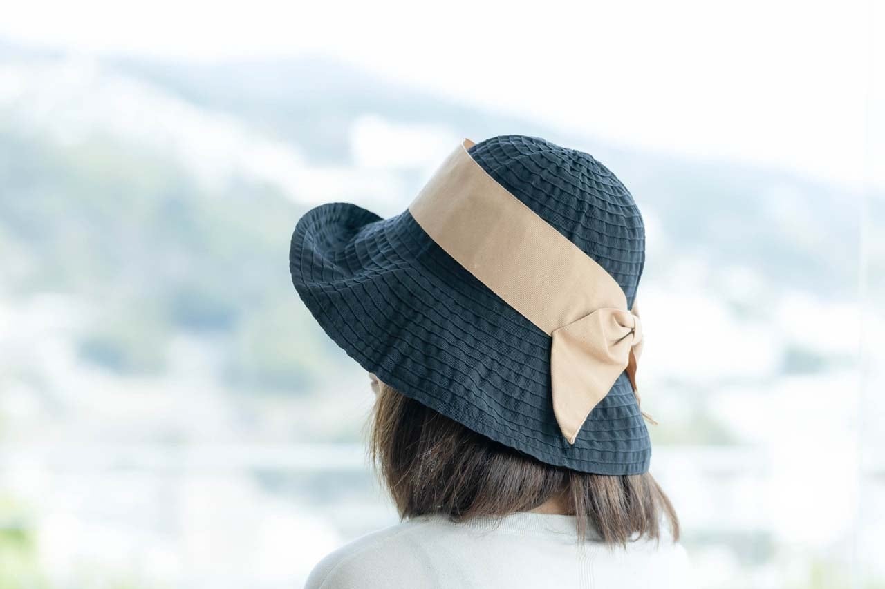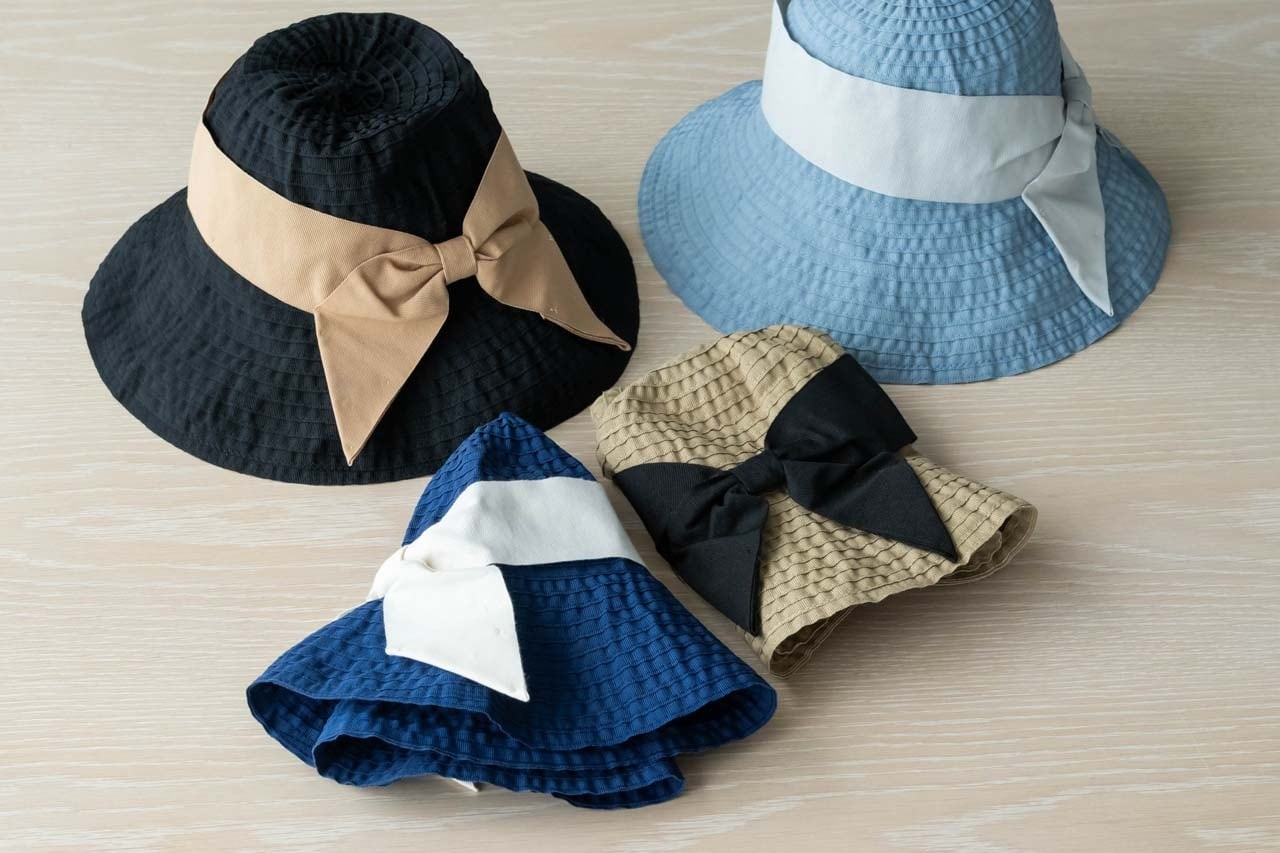 つばが広く、アクセントになる幅広リボンが大人可愛い雰囲気に。軽量で折りたためるので、気軽に携帯もできます。
