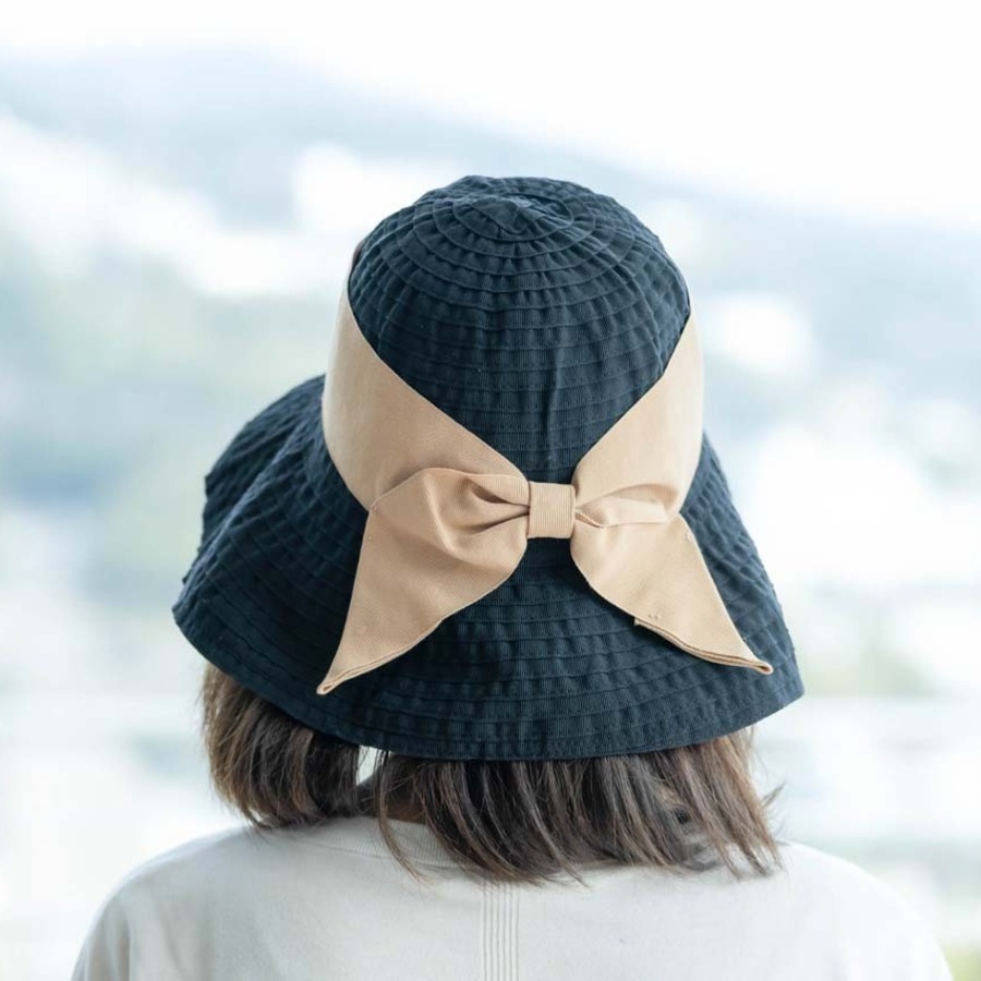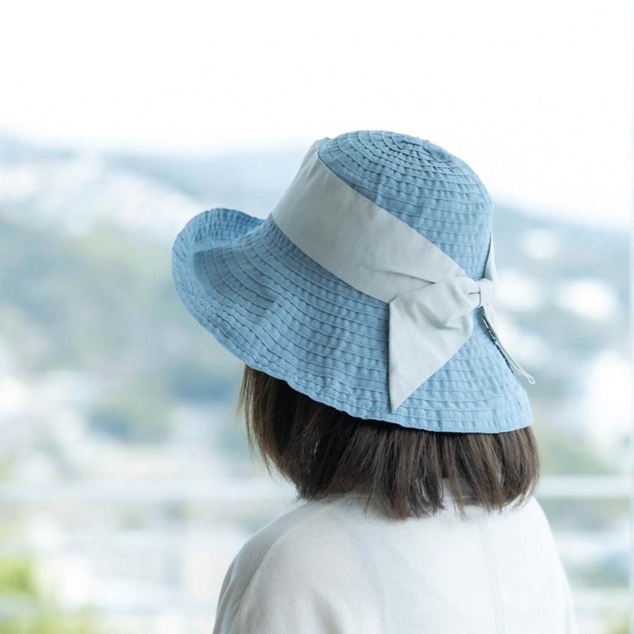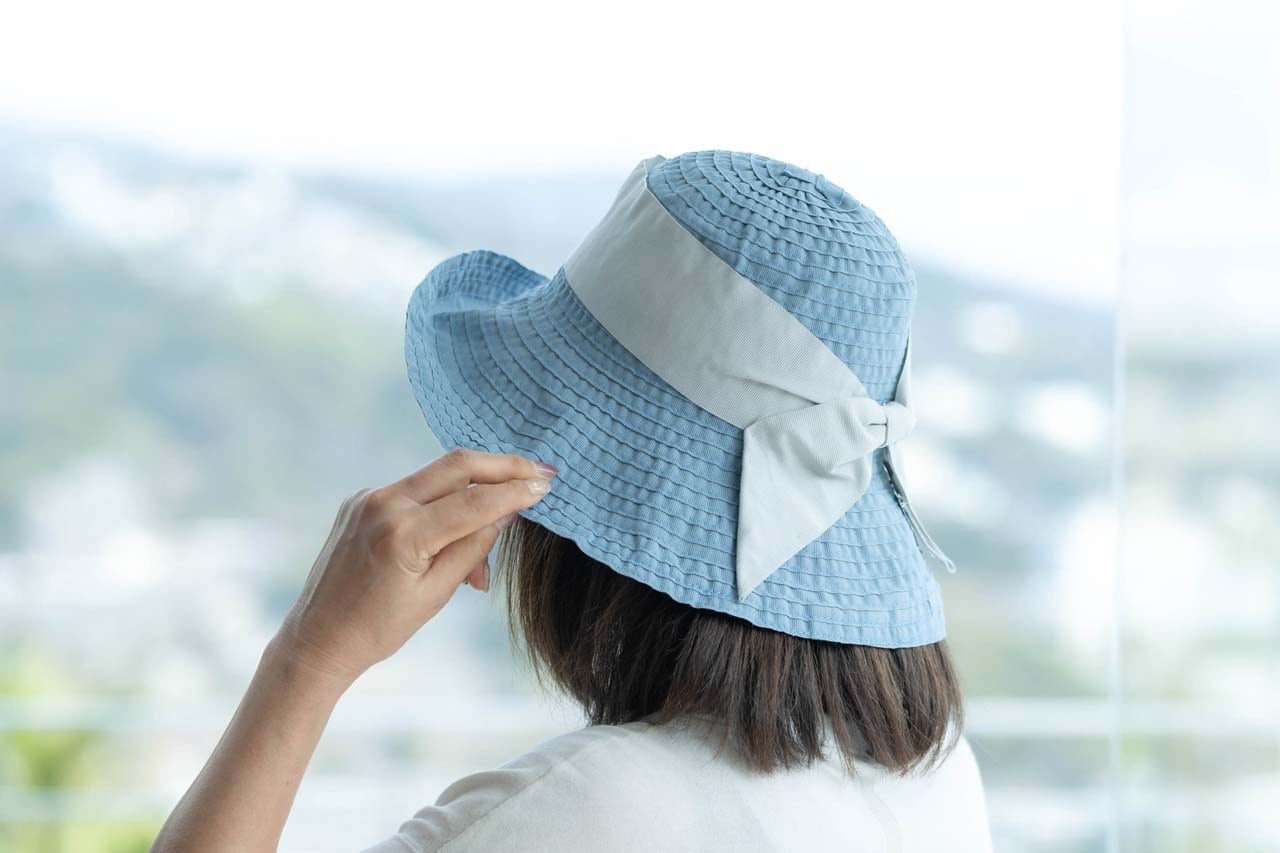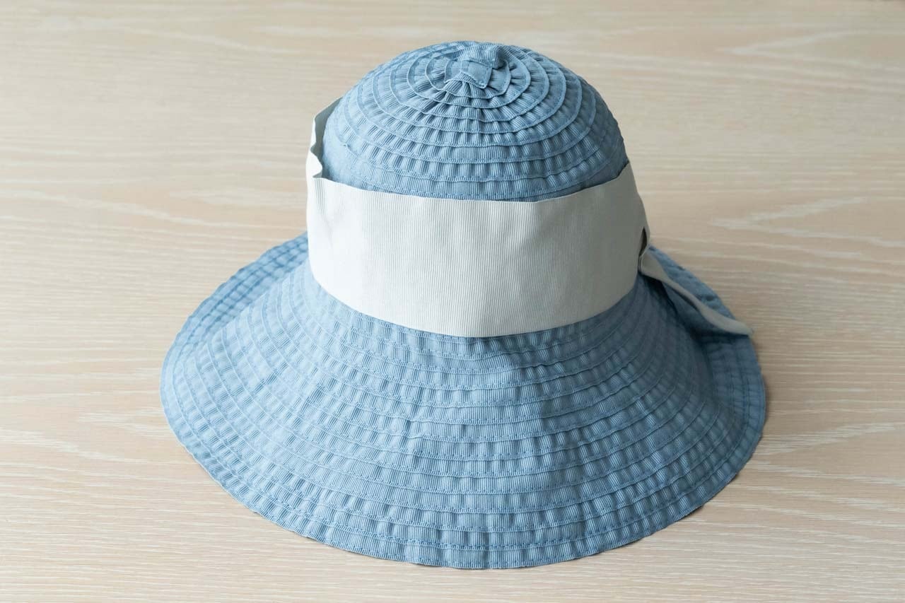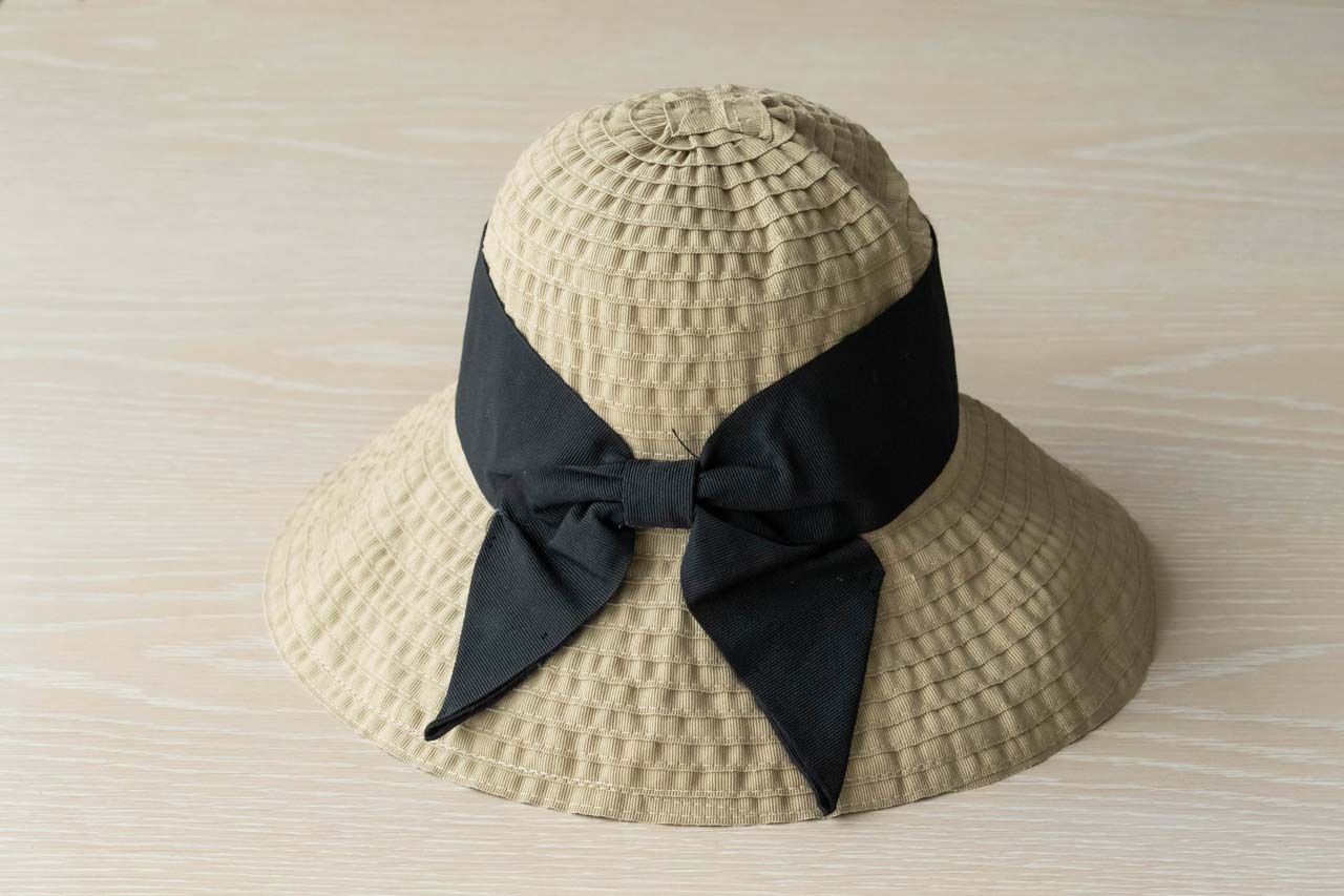 つばが広く、アクセントになる幅広リボンが大人可愛い雰囲気に。軽量で折りたためるので、気軽に携帯もできます。