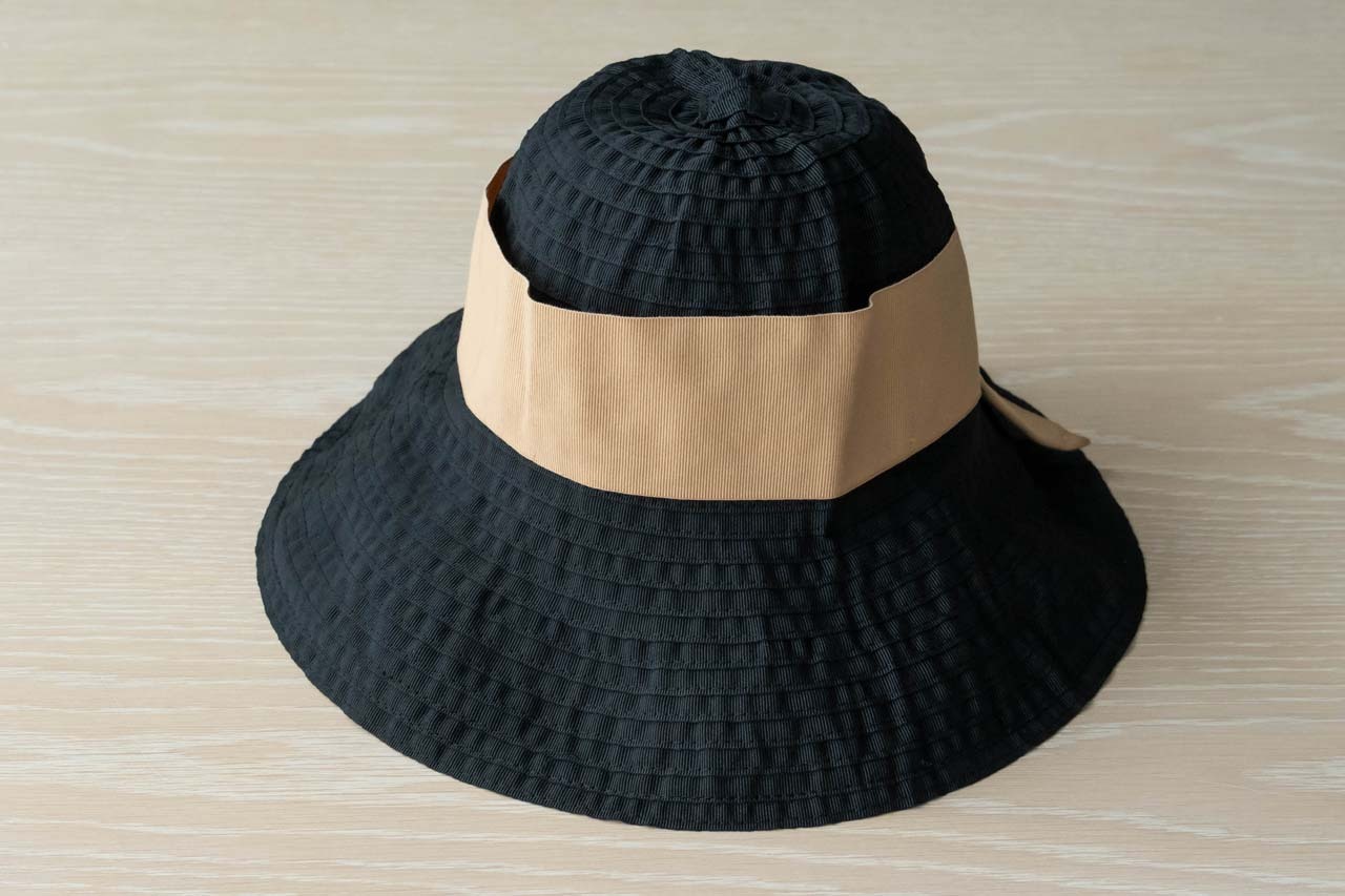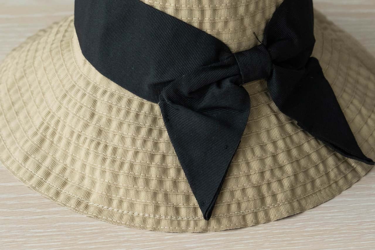 ナチュラルベージュに黒のリボン。麦わら帽子カラーなので、どんなコーデに合う組み合わせ。