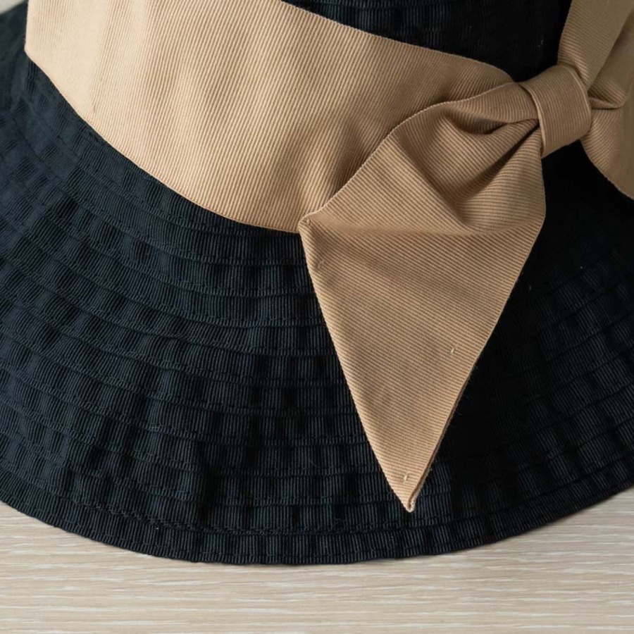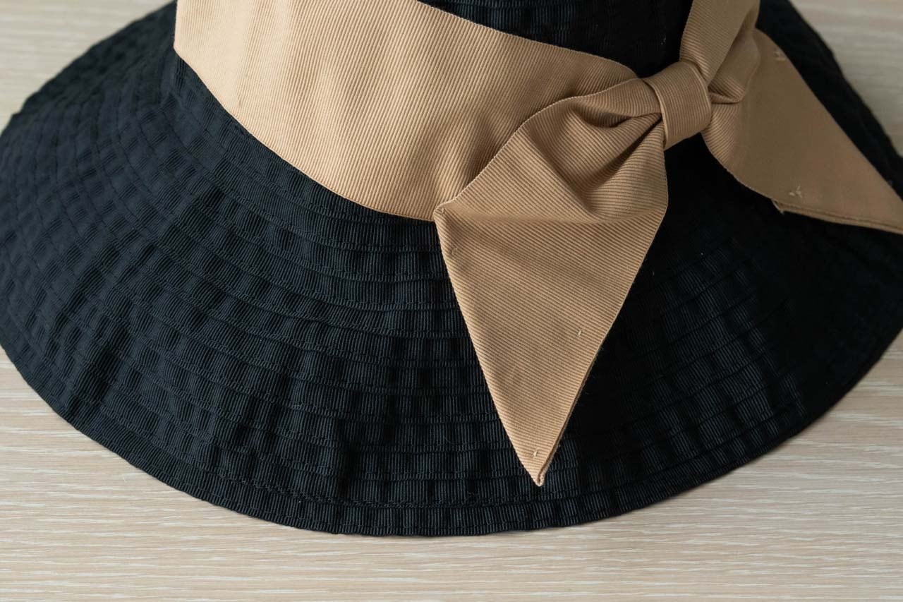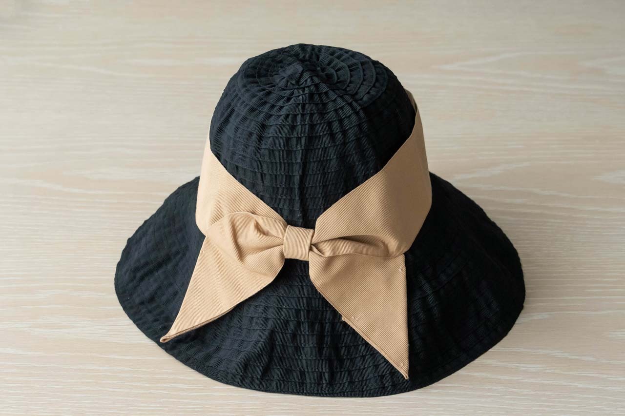 定番のブラックはベージュのリボン。エレガントな雰囲気で、夏のブラックコーデにはぴったりです。
