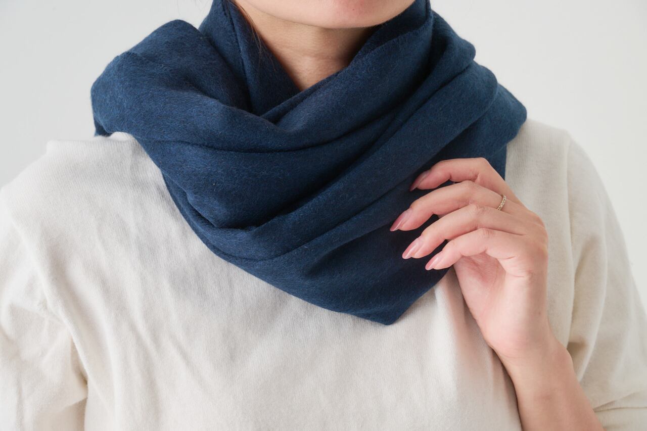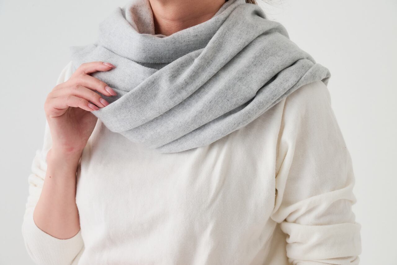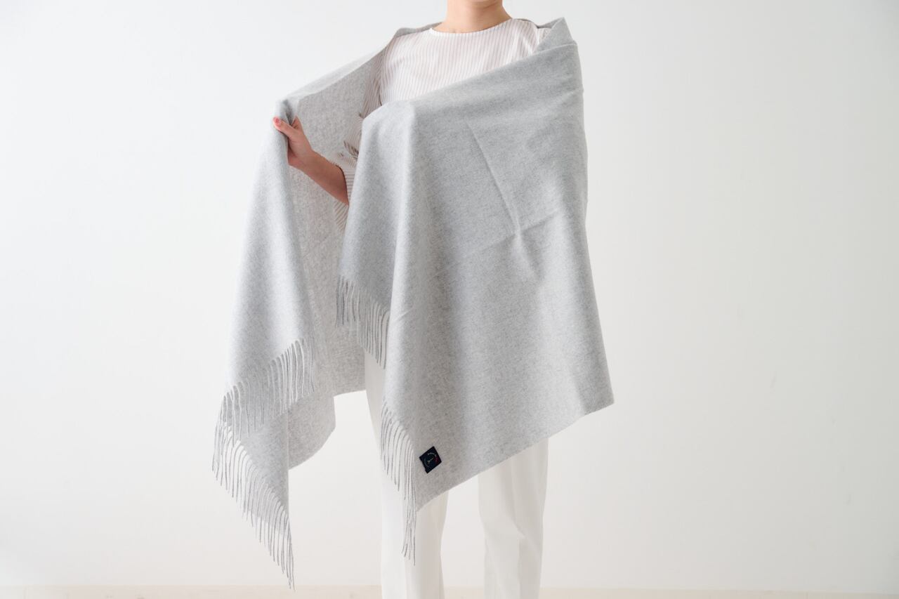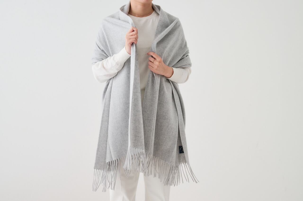 秋や春の肌寒い季節はブランケットのように肩にかけ、真冬はマフラーとして活躍。包まれるだけで、心も体も暖かくなる1枚をぜひ体感してください。