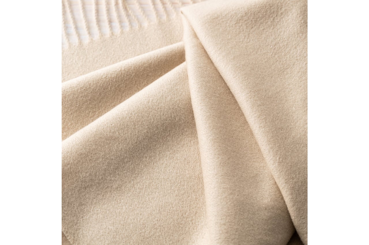 下地の織をしっかり織り込み密度を高めているのがCashmeeの特長。日本では、最初からふわふわしている風合いが好まれますが、欧米では使っていくうちにふっくらと変化していく楽しさを好むそう。