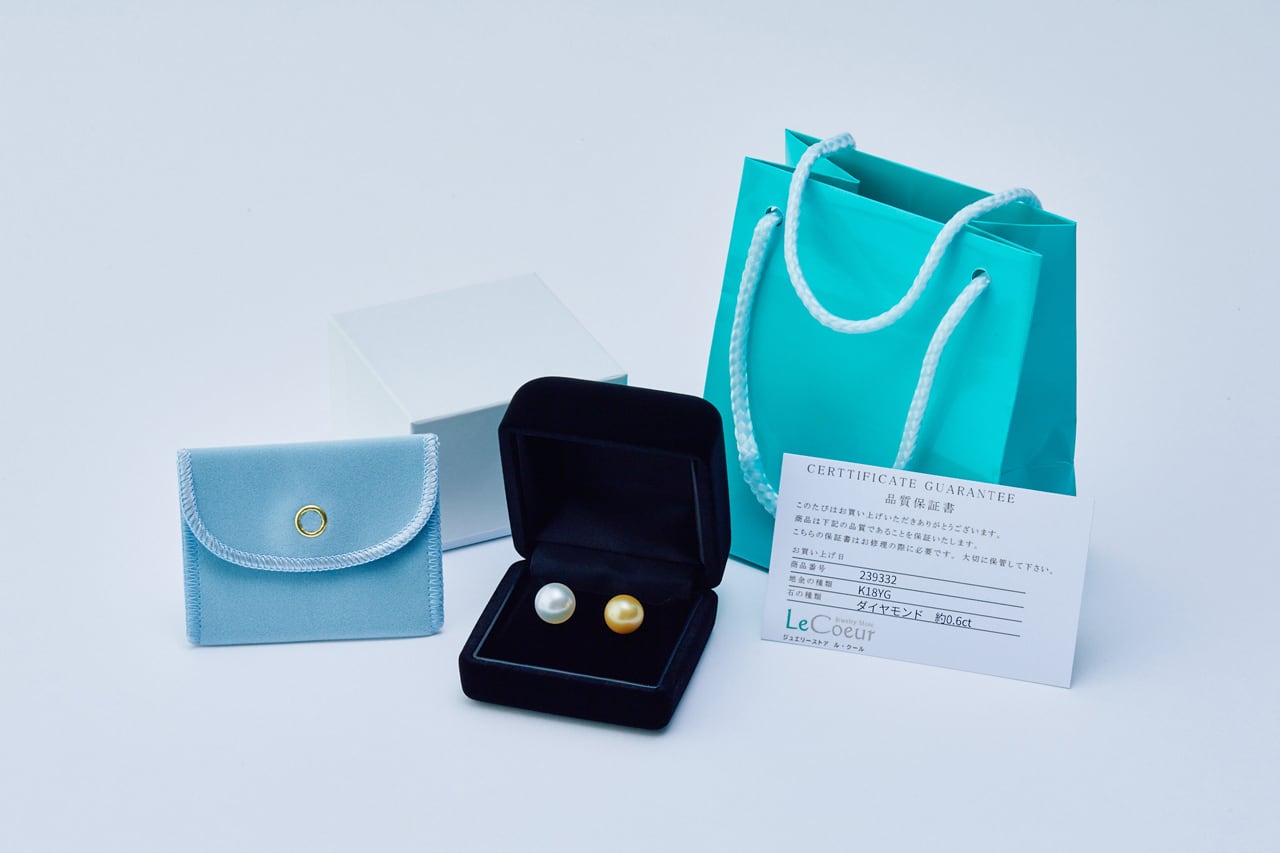 大切に保管できるベルベット調のジュエリーケース、持ち運びに便利なジュエリーポーチに、メーカーの品質保証書もつけました。
