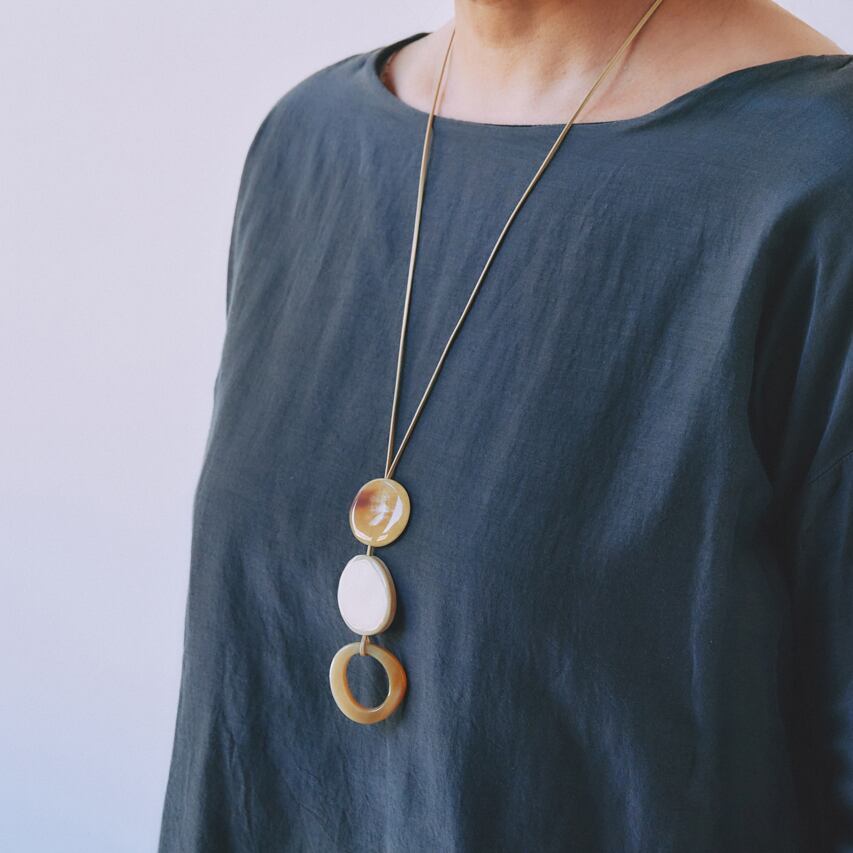 「コーディネイトのアクセントに、大ぶりのペンダントは大活躍してくれますよね。『Bijoux Kei』さんのうつろいペンダントは、形の違う3つの丸の組み合わせがなんとも素敵です。表と裏の模様が違うので、3つの丸の裏表を変えていろいろ楽しめちゃいます。