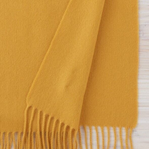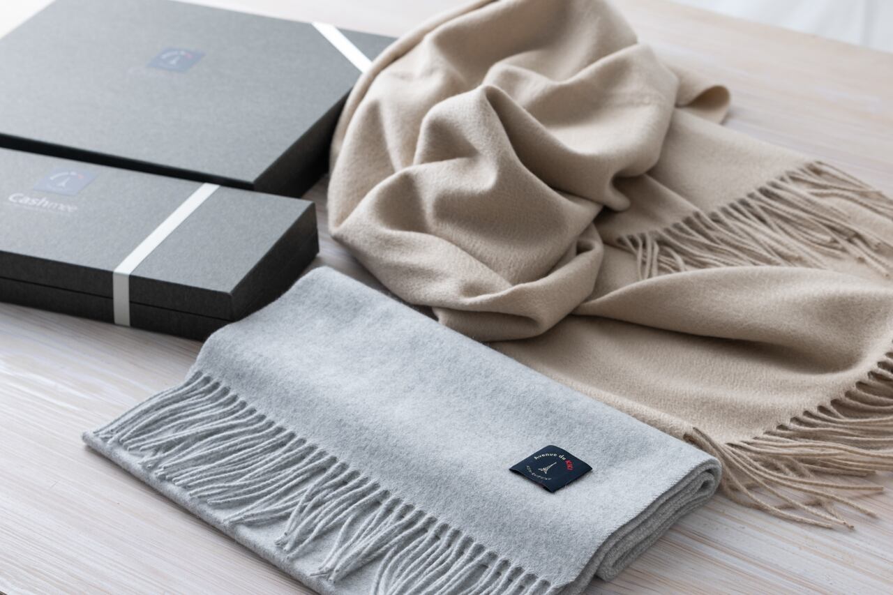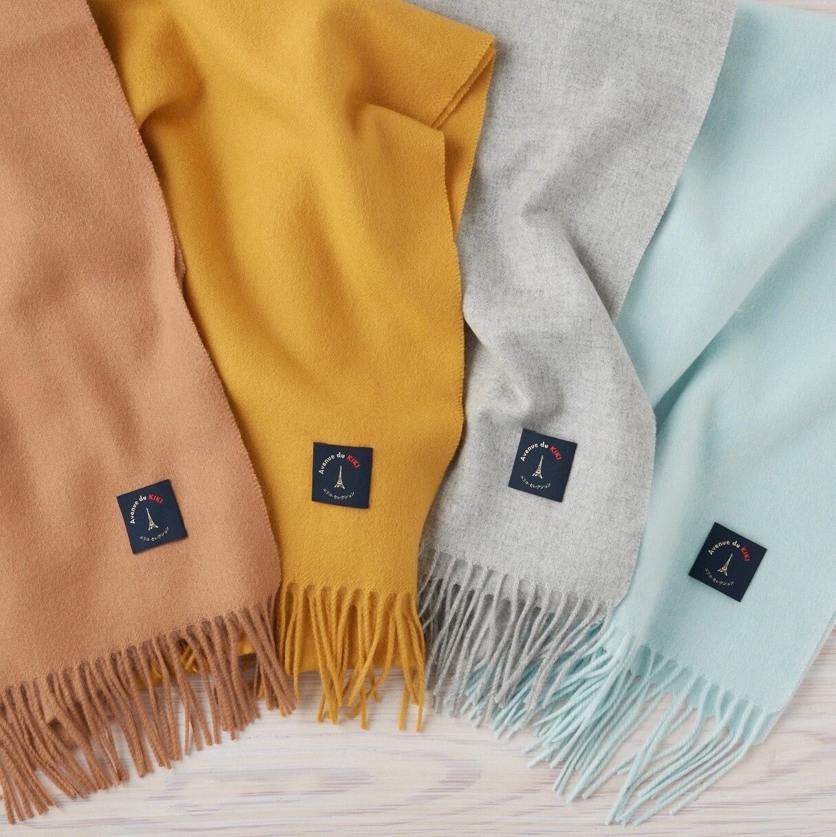 「マフラーは、クルっと巻くだけで、長さのバランスもとりやすいサイズが魅力です。爽やかなアクアブルーはとっても上品ですし、マスタードイエローは重たい色味になりがちな冬のコーディネートをパッと明るくしてくれます。キャメルとライトグレーは、年齢や性別問わずの使い勝手のいい色味なので、贈り物にもぴったり。高級カシミヤの温かさと肌触りをぜひ実感してください」