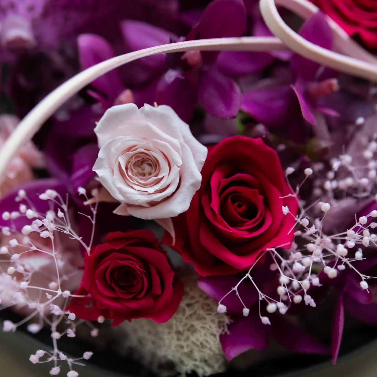 「ナチュラルなプリザーブドフラワーのバラをメインに造花のランをあしらったアレンジメントです。贈り物としてお渡しして、蓋を開けるとお花がいっぱいのサプライズ! そのまま飾れるので、とても喜ばれます」と小松さん。