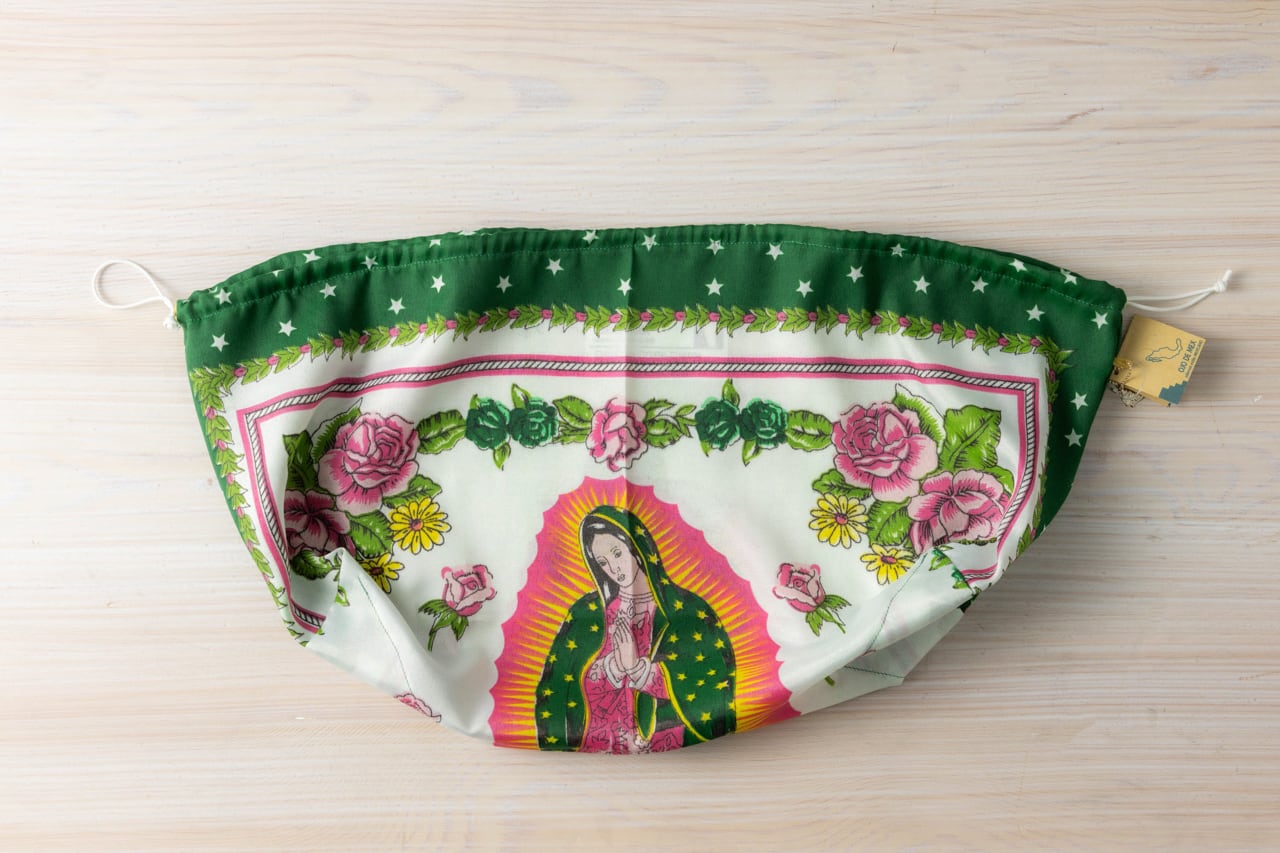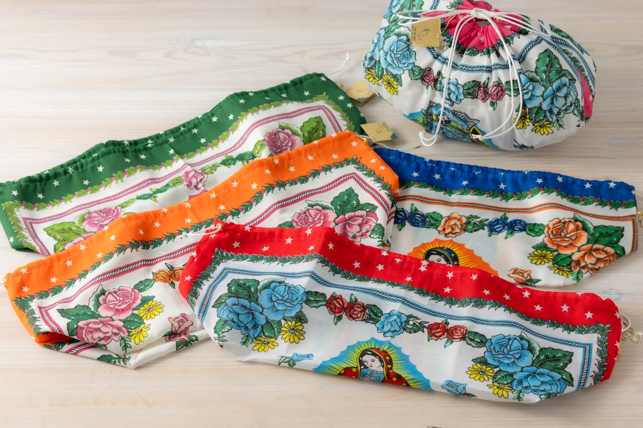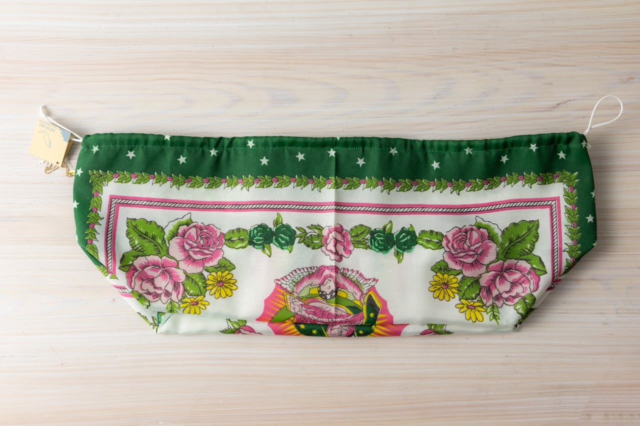 メキシコの象徴的なモチーフ、聖母マリア“ グァダルーペ ”のバンダナをリメイクした巾着ポーチです。