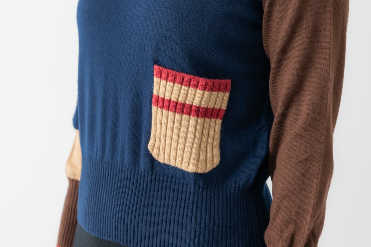 1枚のニットに4色の糸を使ったマルチカラーのラウンドネックニット。
