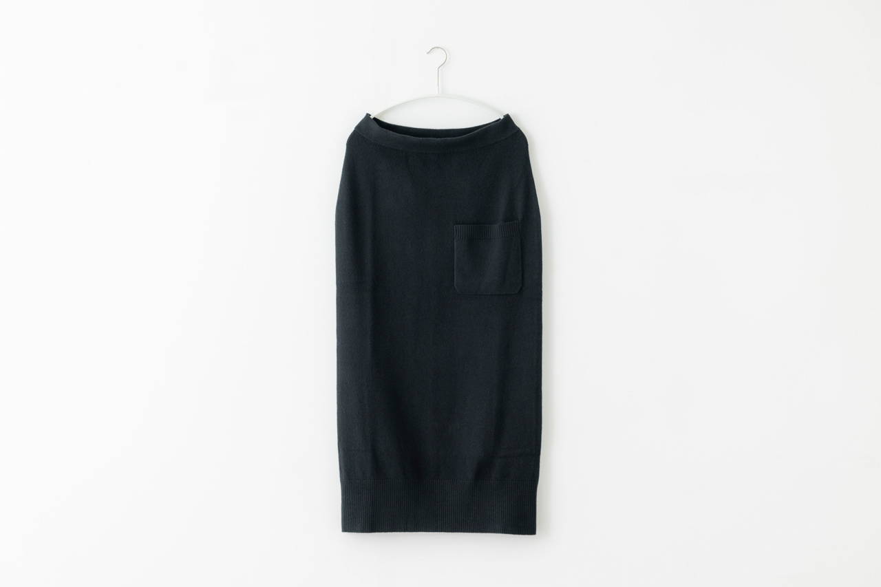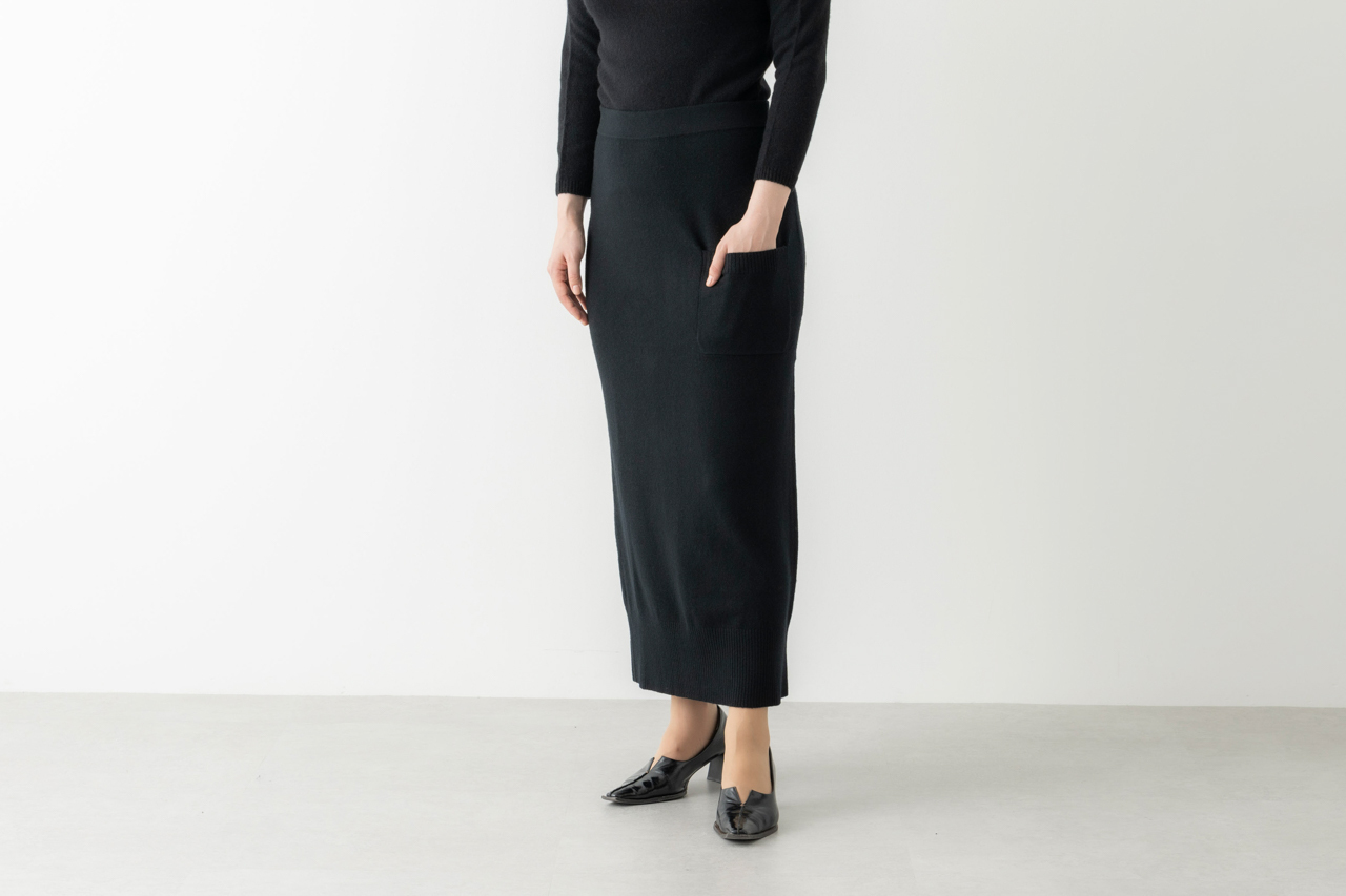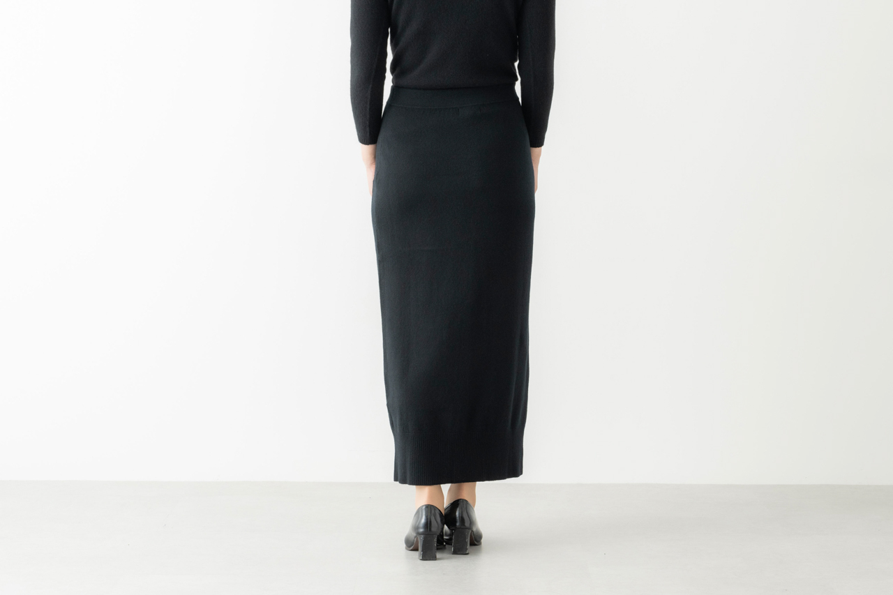 「ロングタイトのニットスカートは。シワになりにくく、手持ちのニットにも合わせやすいから、大活躍しそうです。タイトといってもゆとりがあり、ロングなので、すっきり見えます」
